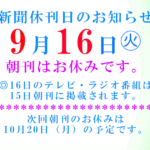 - 新聞休刊日のお知らせ9月16日(火)朝刊は休刊日のためお休みです。また、9月15日(月・敬老の日)と9月23日(火・秋分の日)は休… 続きを読む: 新聞休刊日のお知らせ