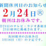 - 休刊日のお知らせ2月24日(火)朝刊は休刊日のためお休みです。また、2月23日(月)は祝日(天皇誕生日)のため夕刊がお休みにな… 続きを読む: 休刊日のお知らせ