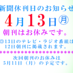 - 新聞休刊日のお知らせ4月13日(月)朝刊は新聞休刊日のためお休みです。また、4月29日(水)は祝日(昭和の日)のため夕刊がお休みに… 続きを読む: 新聞休刊日のお知らせ