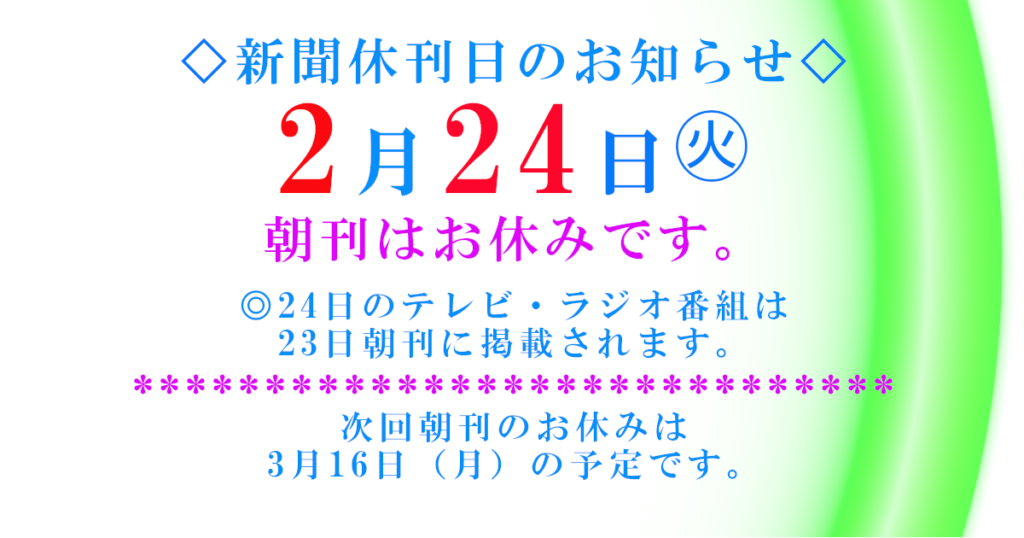 休刊日のお知らせ 2026年2月17日 最終更新日時 : 2026年2月17日 motohachi-k2 2月24日(火)朝刊は休刊日のためお休みです。また、2月23日(月)は祝日(天皇誕生日)のため夕刊がお休みになります。ご不便をお掛けしますがよろしくお願い致します。
