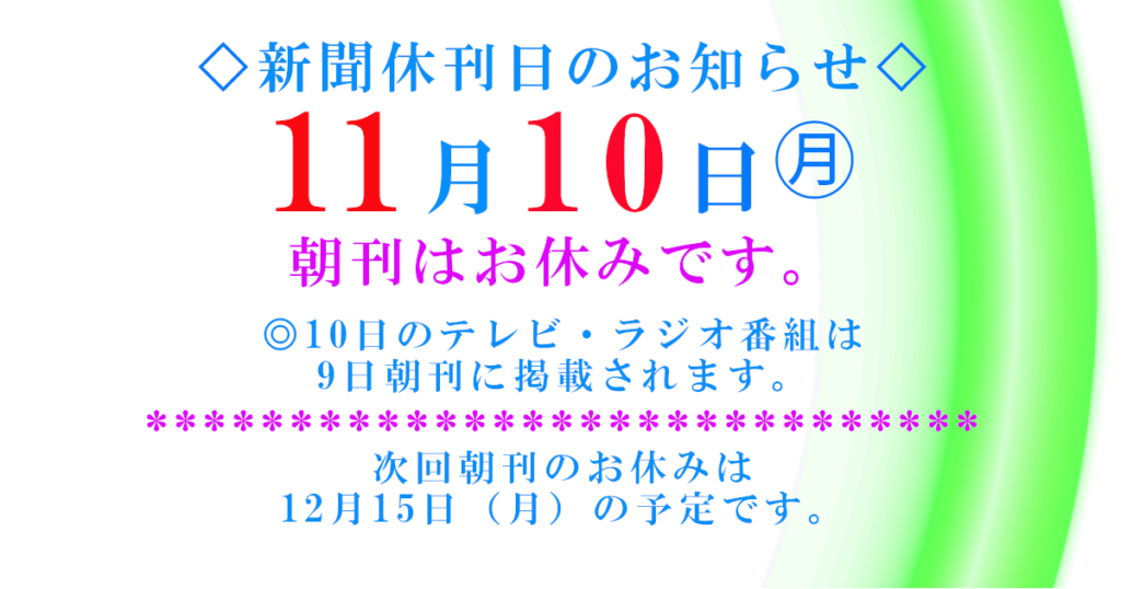 新聞休刊日のお知らせ 2025年11月7日 最終更新日時 : 2025年11月7日 motohachi-k2 11月10日(月)は新聞休刊日のため朝刊はお休みになります。また、11月24日(月)は振替休日のため夕刊はお休みです。ご不便をおかけしますがよろしくお願いいたします。