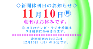 11月10日(月)は新聞休刊日のため朝刊はお休みになります。また、11月24日(月)は振替休日のため夕刊はお休みです。ご不便をおかけしますがよろしくお願いいたします。