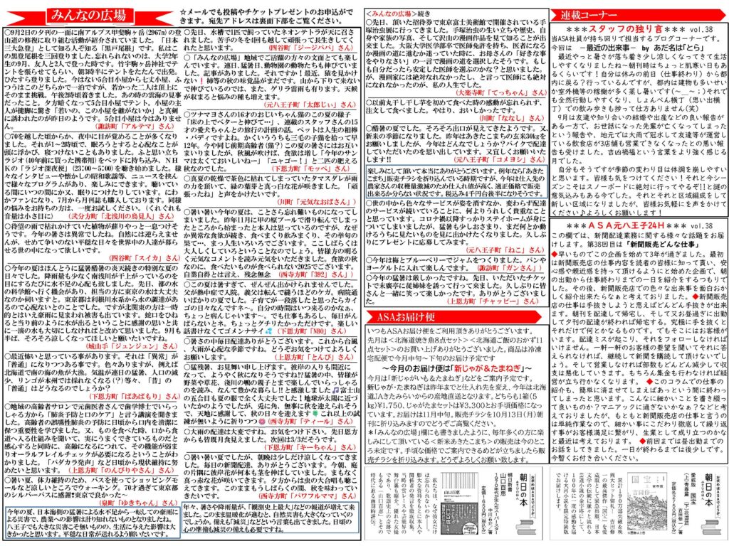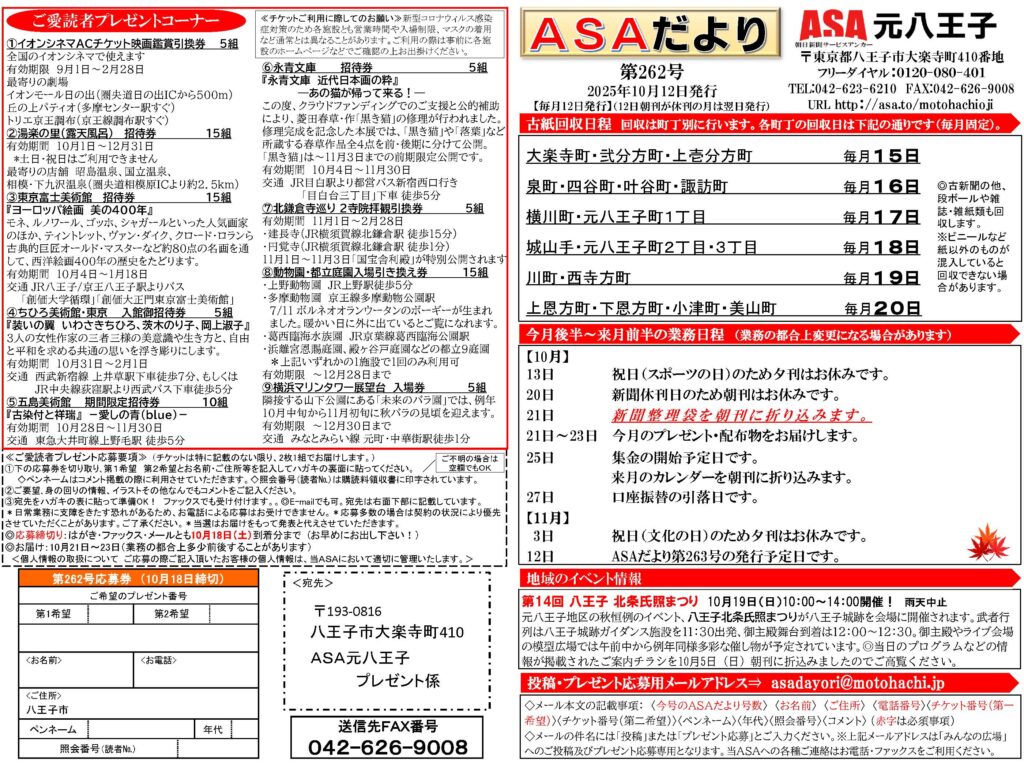 当ASAのミニコミ紙「ASAだより」第262号を発行しました。10月12日(日)朝刊に折り込まれています。今月のチケットプレゼントは<イオンシネマACチケット映画観賞引換券><湯楽の里招待券>など9種類。芸術の秋を迎え、展覧会のチケットも4種類用意しました。どうぞご高覧ください。